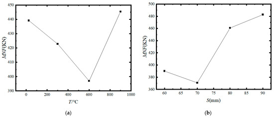 Mean normal force (MNF) versus penetration, tool tip distance, confining pressure, and temperature. (a) MNF versus different temperatures. (b) MNF versus different spacing patterns. (c) MNF versus different penetration degrees. (d) MNF versus different confining pressure conditions.