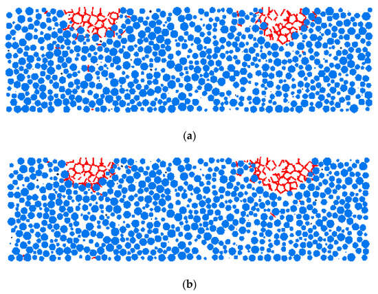 The calibration errors of the internal friction angle and compressive strength are shown in Table 3 and Table 4. After thermal damage was performed, uniaxial and triaxial numerical simulations were performed, and the principles of the numerical simulations were consistent with those established at room temperature. Since this contact only considers heat transfer, the amount of damage to the peak strength at 900 °C was found to be smaller than that of the test conditions. By comparing the numerical simulations with the indoor experiments, we found that the numerical simulations are basically consistent with the indoor experiments and that the error rate of peak intensity is within five percent. A comparison between laboratory experiments and numerical simulation experiments is shown in Figure 9. Since the damage to the elastic modulus was not considered in the PFC3D numerical simulation, the elastic modulus of the rock masses was damaged in the actual indoor experiments due to the effects of heat. Therefore, the strain values of indoor experiments and numerical simulations under high-temperature conditions are different. Still, since the subsequent numerical simulations study the transfer between contact forces of particles, the thermal contact model chosen for PFC3D was found to be feasible. A final determination of the thermodynamic parameters is shown in Table 5. From indoor experiments, it was observed that during heating, some rock debris falls off the surface of the rock sample and partial micro-cracks appear. According to numerical simulations, it can be observed that as the temperature propagates inward, the contact bonds between PFC particles first fracture at the locations where the external contact forces are weaker. Moreover, with increasing temperature, the contact forces between particles fail, leading to the detachment of fractured particles. This phenomenon is consistent with the shedding of rock debris observed in indoor experiments. The changes in contact bonds are clearly evident in the numerical simulation results.