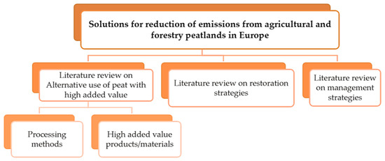 After defining the main questions, appropriate keywords and their combinations to answer these questions were selected. Keywords of four distinct categories were chosen—(1) overview of the state-of-the-art peatlands, (2) emissions, (3) restoration and management strategies, (4) and peat use for materials and products—for a qualitative analysis of the scientific literature combined with the study of reports.