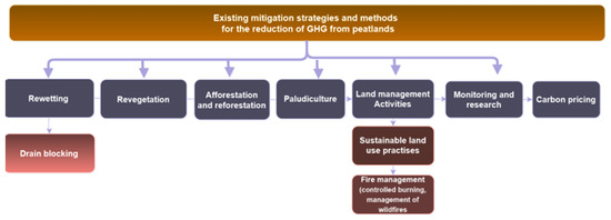 Various strategies and approaches are known to reduce GHG emissions, including the reduction of the intensity of agriculture, peatland afforestation and reforestation [73], and peatland rewetting [117,118]. Also, paludiculture methods have become more widely used in recent years [119]. Other restoration methods include, for example, restoring natural marsh vegetation or planting vegetation [40]. The existing emission mitigation strategies are shown in Figure 2.