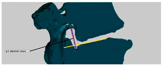 Measurement method. Purple line represents the maximum vertical dimension [y1 wymiar max]; the yellow line represents the endplate of the vertebral body.