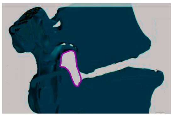 The surface area measurement method consisted of the following steps. In the first phase, the maximum vertical dimension of the L4/L5 root canal was determined. In the next stage of the measurement, the maximum vertical dimension of the root canal L4/L5 was applied to the visualization of the cross-section. Knowing the vertical dimension of the channel is expressed in mm, we calculated how many pixels fit in a square with a side equal to the vertical dimension. In this way, the scale was established as the number of pixels that fit in 1 mm2 of the area in the cross-section visualization. In the last phase of the research, the cross-sectional area obtained was marked with a loop (Figure 2) and information on the number of pixels corresponding to the area of the selected area on the visualization was read. Then, using the proportion, the surface area of the intervertebral foramen cross section was calculated. We applied same procedure for L5/S1 root canal.