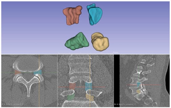 Screenshot from Slicer 3D showing the creation methodology for creating 3D models of the intervertebral foramina. The Supplementary Materials contain an animation presenting 3D models of intervertebral foramina [Video S1].