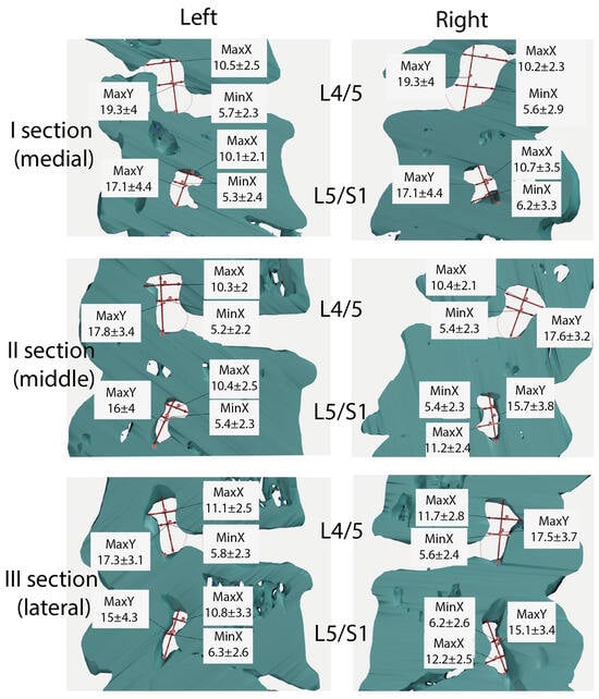 If the MinX parameter is taken into account, its highest L4/5 value was observed in the III section. This was 5.8 mm (right side). On the other hand, in the L5/S1 motion segment, it was 6.7 mm (right side, section II). The minimum MinX value for the L4/5 motion segment was 5.2 mm (left side, section II); in the L5/S1 motion segment, it was 5.3 mm.