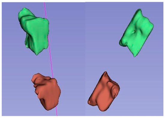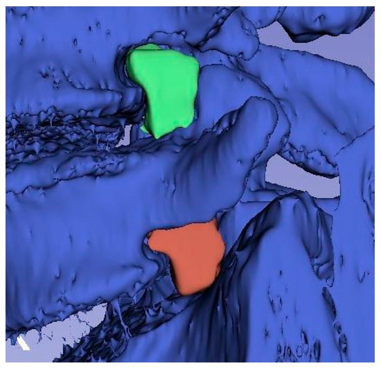 Sample 3D models of the intervertebral canals on the left side at L4/L5 (green) and L5/S1 (brown) before extracting them from the spine model.