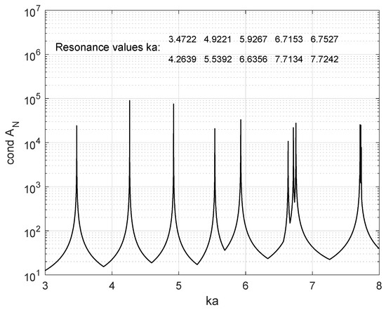 The following example provides positive answers to these questions. Figure 13 displays the spectral dependence of the condition number for the circular waveguide with an eccentrically embedded circular rod studied with the same parameters () as in Section 3.2 (see Figure 4). A truncation number of was employed in this figure. The condition number was computed in the interval using 500 points with increment . The computation times were approximately the same as for the computations described in Section 3.2 for the same truncation numbers.