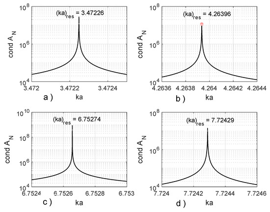 Figure 3 shows the condition number as a function of the non-dimensional wave number , for these four values of eccentricity and truncation number . As can be seen, the spectral dependence of is highly sensitive to the roots of the characteristic equation , indicated by the sharp resonance peaks at those points where coincides with one of the roots of this equation. Ideally, in the absence of the heat losses in the walls of the waveguide, the resonance peaks of occur exactly at those values , which match precisely the zeros of the characteristic equation and the resonance maxima of should be of infinite magnitude. In practice, when we employ the truncated equations, the magnitude of the resonance peaks is finite and increases with the growth of the truncation number N; the accuracy of the calculated cut-off wavenumbers strictly depends on its value. The second kind nature of the Fredholm matrix system obtained by application of the MAR to the waveguide problem ensures that the algorithm for calculating the cut-off wavenumbers with any prescribed (i.e., pre-specified) accuracy is reliable and fast converging.