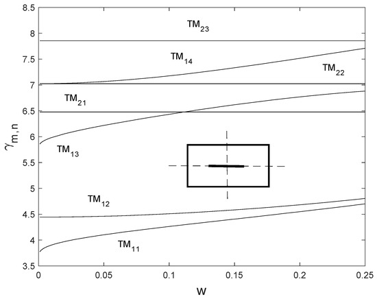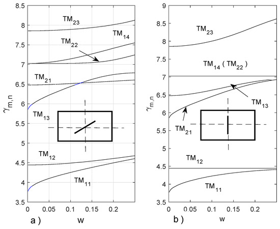 It can be seen that the cut-off wavenumbers of the modes are nearly independent of the strip width, indeed nearly independent of the strip’s presence or absence. These modes have an even number of oscillations between the wider walls of the waveguide; the distribution of the modal electromagnetic field for modes does not cross the locations of the intensity maxima, and, hence, the strip does not sensibly perturb this distribution. On the other hand, the cut-off wavenumbers of the modes are noticeably affected, increasing in value as w increases.