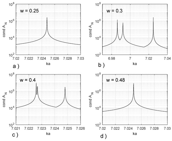 Evolution of the resonance duplet in the condition number as w increases: (a) w = 0.25, (b) w = 0.3, (c) w = 0.4, and (d) w = 0.48.