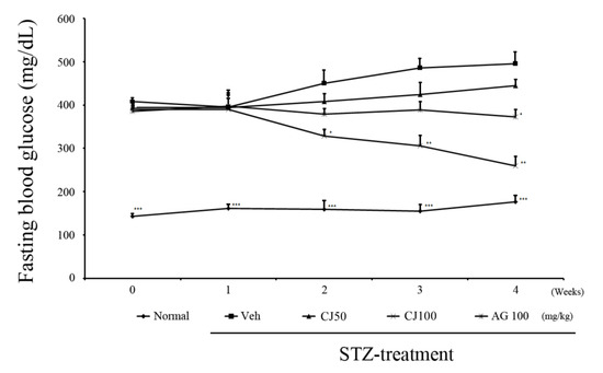 Effects of CJ on levels of fasting glucose test. * p < 0.05, ** p < 0.01, and *** p < 0.005 compared with the Veh groups. Normal, non-diabetic rats; Veh, STZ 30 mg/kg-treated rats; CJ 50, STZ 30 mg/kg + CJ 50 mg/kg-treated rats; CJ 100, STZ 30 mg/kg + CJ 100 mg/kg-treated rats; AG 100, STZ 30 mg/kg + aminoguanidine 100 mg/kg-treated rats.