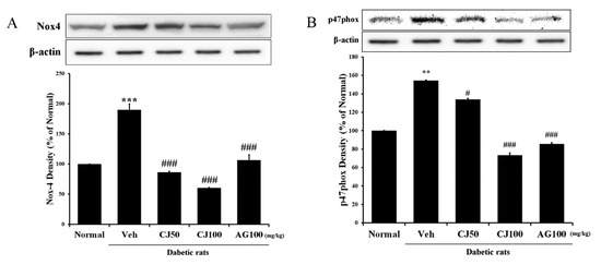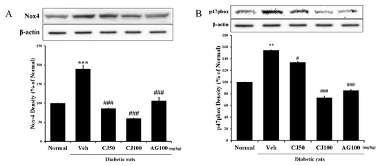 Hepatic NADPH oxidase subunit related protein expression. (A) NOX-4 expression; (B) p47phox expression. Normal, non-diabetic rats; Veh, STZ 30 mg/kg-treated rats; CJ 50, STZ 30 mg/kg + CJ 50 mg/kg-treated rats; CJ 100, STZ 30 mg/kg + CJ 100 mg/kg-treated rats; AG 100, STZ 30 mg/kg + aminoguanidine 100 mg/kg-treated rats. Values are expressed as the mean ± SEM (n = 8). ** p < 0.01, *** p < 0.001 compared with Normal. # p < 0.05, and ### p < 0.001 compared with Veh.