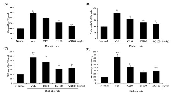 Effects of CJ on renal (A) glucose concentration, (B) triglyceride production, (C) ROS production, and (D) LDH production in STZ-induced rats. Normal, non-diabetic rats; Veh, STZ 30 mg/kg-treated rats; CJ 50, STZ 30 mg/kg + CJ 50 mg/kg-treated rats; CJ 100, STZ 30 mg/kg + CJ 100 mg/kg-treated rats; AG 100, STZ 30 mg/kg + aminoguanidine 100 mg/kg-treated rats. Values are expressed as the mean ± SEM (n = 8). ** p < 0.01 compared with Normal. + p < 0.05 and ++ p < 0.01 compared with Veh.