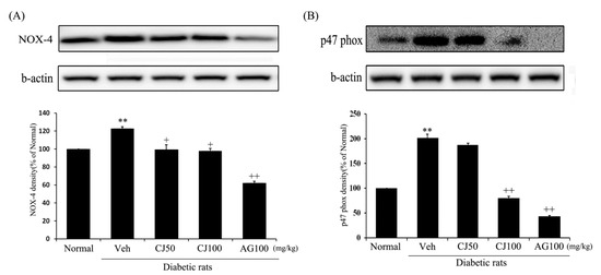 Effects of CJ on renal (A) NOX-4 and (B) p47 phox protein expression in STZ-induced rats. Normal, non-diabetic rats; Veh, STZ 30 mg/kg-treated rats; CJ 50, STZ 30 mg/kg + CJ 50 mg/kg-treated rats; CJ 100, STZ 30 mg/kg + CJ 100 mg/kg-treated rats; AG 100, STZ 30 mg/kg + aminoguanidine 100 mg/kg-treated rats. Values are expressed as the mean ± SEM (n = 8). ** p < 0.01 compared with Normal. + p < 0.05, and ++ p < 0.01 compared with Veh.