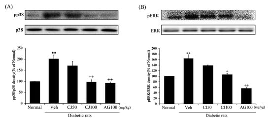 Effects of CJ on renal MAPKs related protein expression in STZ-induced rats. (A) p-p38/p38; (B) p-ERK/ERK. Normal, non-diabetic rats; Veh, STZ 30 mg/kg-treated rats; CJ 50, STZ 30 mg/kg + CJ 50 mg/kg-treated rats; CJ 100, STZ 30 mg/kg + CJ 100 mg/kg-treated rats; AG 100, STZ 30 mg/kg + aminoguanidine 100 mg/kg-treated rats. Values are expressed as the mean ± SEM (n = 8). ** p < 0.01 compared with Normal. + p < 0.05, and ++ p < 0.01 compared with Veh.