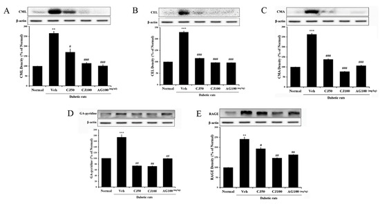 Effects of CJ on hepatic AGEs-related protein expression in STZ-induced rats. (A) CML; (B) CEL; (C) CMA; (D) GA-pyridine; (E) RAGE expression. Normal, non-diabetic rats; Veh, STZ 30 mg/kg-treated rats; CJ 50, STZ 30 mg/kg + CJ 50 mg/kg-treated rats; CJ 100, STZ 30 mg/kg + CJ 100 mg/kg-treated rats; AG 100, STZ 30 mg/kg + aminoguanidine 100 mg/kg-treated rats. Values are expressed as the mean ± SEM (n = 8). ** p < 0.01 and *** p < 0.001 compared with Normal. # p < 0.05, ## p < 0.01, and ### p < 0.001 compared with Veh.