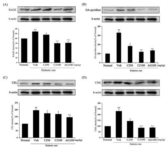Effects of CJ on renal AGEs-related protein expression in STZ-induced rats. (A) RAGE; (B) GA-pyridine; (C) CEL; (D) CML expression. Normal, non-diabetic rats; Veh, STZ 30 mg/kg-treated rats; CJ 50, STZ 30 mg/kg + CJ 50 mg/kg-treated rats; CJ 100, STZ 30 mg/kg + CJ 100 mg/kg-treated rats; AG 100, STZ 30 mg/kg + aminoguanidine 100 mg/kg-treated rats. Values are expressed as the mean ± SEM (n = 8). ** p < 0.01 compared with Normal. + p < 0.05, and ++ p < 0.01 compared with Veh.
