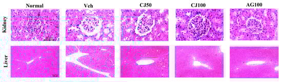To evaluate the protective effects of CJ on histological changes, hematoxylin and eosin (H&E) staining was performed. Figure 10 showed pathological changes in the liver and kidney of the Veh group compared with the Normal group. The renal dysfunction in diabetic mice is accompanied by structural disturbances in the renal tubular epithelium, glomerular vasculature, and interstitium. Consistent with these findings, our experimental results also showed structural abnormalities in the renal tubular epithelium and interstitium in the Veh group. While these histological changes in the kidney were less pronounced in the CJ50 group, a notable restoration of the morphology of the tubules and glomeruli was observed in the CJ100 group compared to the Veh group.