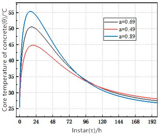 - The smaller the influence coefficient a, the smaller the maximum temperature that can be reached, and the smaller the temperature change. However, there is no significant change in the effect of the influence coefficient a on the time it takes for concrete to reach the maximum temperature. Therefore, the maximum temperature of the concrete can be controlled by adjusting the influence coefficient a.