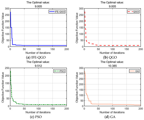 Regarding the final objective function value, which represents the overall operation time of the system used for overcurrent protection, both the IFE-QGO and the QGO algorithm achieve the best results, demonstrating their superior ability for a global search. The IFE-QGO algorithm, with the assistance of IFE, enhances computational efficiency and running speed. In contrast, classical heuristic algorithms, such as PSO and GA, tend to get trapped in local optimal solutions. By employing the IFE-QGO algorithm, significant time savings of 0.507 s and 1.380 s can be achieved for the power system, respectively.