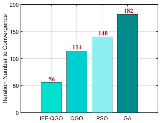 It can be concluded from the analysis of the figure and table above that the combined IFE-QGO algorithm has certain advantages over other heuristic algorithms in terms of global convergence speed, and the number of iterations is reduced by 50.88%, 60.00%, and 69.23%, respectively. In terms of running time, the IFE-QGO method is still more efficient, which is shortened by 59.25%, 79.71%, and 87.42%, respectively, compared with the other three algorithms.