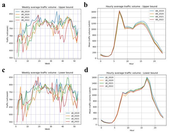 Figure 1b,d depict the hourly average traffic volumes at the upper and lower bounds for the same period. These figures elucidate a consistent hourly pattern over 2019 to 2022 marked by a morning peak at around 7 a.m. at the upper bound (Figure 1b) and an evening peak at around 5 p.m. at the lower bound (Figure 1d). This bimodal distribution indicates the conventional rush hours associated with morning and evening commutes.