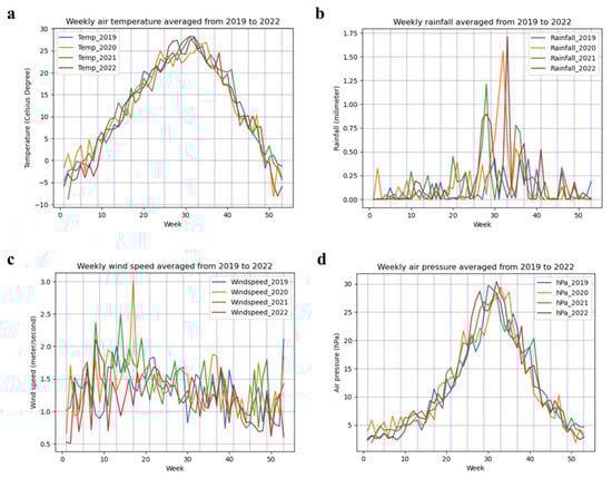 Figure 2a presents the average weekly air temperature from 2019 to 2022, representing a consistent annual pattern with a pronounced peak around week 31, indicative of the climatic zenith typically observed during the midsummer period. Figure 2b illustrates the average weekly rainfall within the same period. The data reveal a notable peak in precipitation around week 33, implying a temporal concentration of rainfall corresponding to regional and seasonal weather patterns. Figure 2c depicts the weekly wind speed averages over the same time period. The graphical representation indicates a relatively stable wind speed pattern irrespective of the annual variations. Figure 2d visualizes the average weekly air pressure from 2019 to 2022. A peak of weekly air pressure is observed at around week 31, aligning with atmospheric pressure changes, often identifying the transition between summer and autumn.
