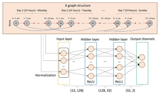 The overall data structure of this study is visualized in Figure 3. Each node of a deep learning approach has a graph structure containing 168 nodes. Each node of the graph represents 1 h. For example, 168 nodes are interconnected in two ways. The first way is the consideration of hourly interdependence. For instance, a node from 0 to 1 a.m. and another node from 1 to 2 a.m. are connected. Furthermore, a node from 0 to 1 a.m. of day 0 and a node from 0 to 1 a.m. of day 1 are connected. Therefore, the graph structure contains 311 nodes representing a 1-week graph structure.