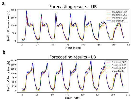 The findings in Table 2 indicate that the GCN with meteorological information and dropout strategies has a better prediction than the other models. The table explains that the accuracy of the GAN and MLP was less than that of the GCN. The MLP without dropout rates performed better than the GCN, but the MLP without dropouts had overfitting issues, which cannot be generalizable to the other detectors. When we consider the future direction of the models, the GCN emerges as a promising alternative. The GCN successfully predicted stable traffic volumes with upper and lower bounds. However, the study also identified the limitation of the attention mechanism. The large weights of the neighbors of a given node make it challenging for the attention mechanism to capture temporal dependencies accurately. This suggests that a strong reliance on the interconnections between neighboring nodes may detrimentally impact the model’s overall predictive capability.