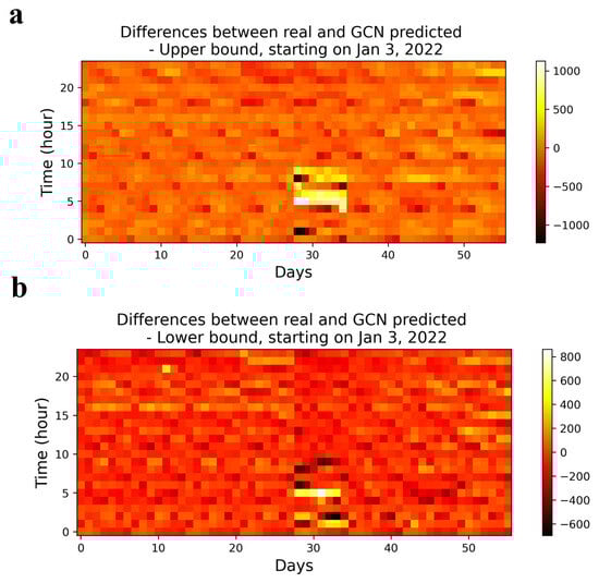 Heatmaps of differences between observed and GCN-predicted results on upper bound (a) and lower bound (b) starting on 3 January 2022.
