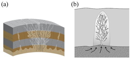 (a) A conceptual cartoon proposed by Ogata et al. showing a fold-related crestal fracture corridor with a network of fluid flow pathways [8]. (b) The conceptual model proposed by Cartwright et al., for fluid escape path growth by hydraulic fracturing in a sedimentary basin [11].