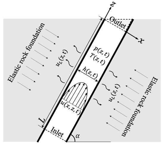 where u represents the vertical speed, is the dynamic viscosity, p is the pressure, is the density, g is the gravitational acceleration, and h is the aperture of the fracture. In this study, we neglect the gravitational term because it is approximately three orders of magnitude lower than the pressure term. The boundary conditions on the two walls are no-slip, as follows,