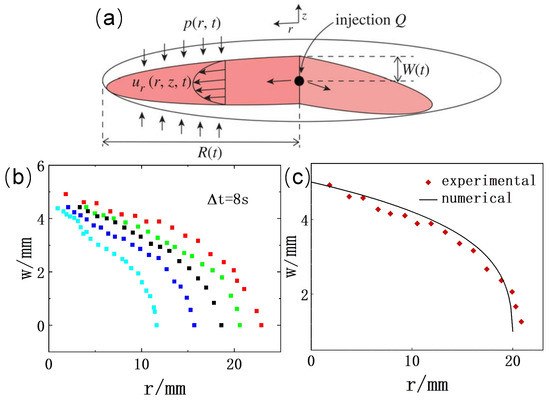 To validate our model, we reproduced a thickness profile of a fluid-driven crack, which was measured in the experiment by Lai et al. [24]. As illustrated in Figure 3a, the fluid was injected into the elastic matrix (gelatin) through a syringe pump, then forming a penny-shaped crack. Driven by the pressure, the crack grew, gradually expanding in the radial (y-) and thick (z-) directions. The geometrical size in the thick direction, 2 W, represents the thickness of the crack, which reduces from the injection point (where r = 0) to the rim of the crack (where r = R). Figure 3b is the thickness distribution we reproduced in the article. The light blue line shows the thickness distribution data for the first crack (28 s). The data were then recorded every 8 s until the liquid in the injection pump was fully injected into the gelatin matrix (60 s) and maintained at this state. We assumed that the fracture was fully developed in 60 s. In the experiment, the elastic modulus of the matrix, E, was 202 kPa, and the viscosity of the fluid was 1.02 Pa s.