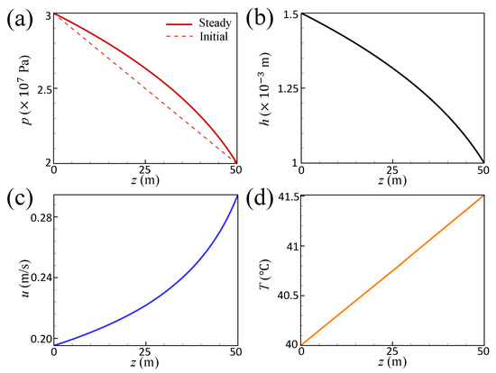 (a) The steady pressure profile; (b) the fracture aperture profile; (c) the velocity profile; and (d) the temperature profile in a closed fracture with .