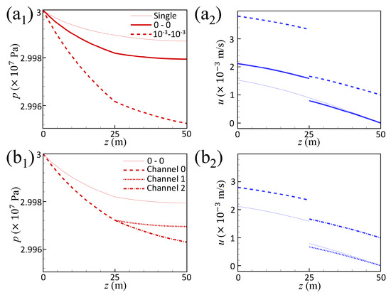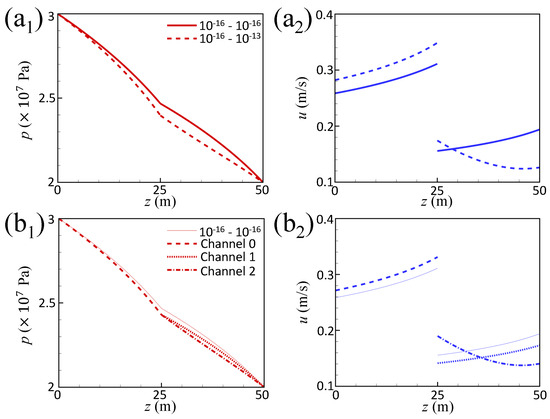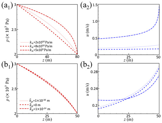 Figure 6(b1) shows the effect of the permeability on the pressure profile, and indicates that the pressure profile is straighter and the interior pressure is slightly lower at a higher permeability. The change in the speed profile with the permeability is more obvious than that of the pressure profile. As shown in Figure 6(b2), the liquid speed at a permeability of 10−16 m is higher than that without any permeability. The reason for the higher liquid speed is that the viscosity of the liquid is higher with a finite permeability. According to Equations (12) and (13), the liquid temperature increases when the leakage velocity, , increases from zero to a finite value, which then increases the liquid viscosity. As the permeability increases from 10−16 m to 10−14 m, the inlet speed continuously increases but the outlet speed decreases, due to the increasing volume of liquid leaving through leakage.