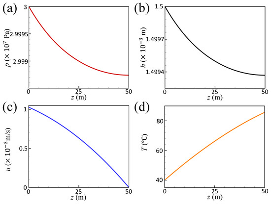 Figure 4 shows the profiles of (a) the liquid pressure, (b) the fracture aperture, (c) the liquid velocity, and (d) the liquid temperature in an open fracture in the steady state. The steady values of the liquid pressure and fracture aperture decrease along the fracture length. As the flux is constant through the fracture based on mass conservation, the liquid speed increases from the inlet to the outlet, which leads to the increasing pressure gradient as shown in (a). According to the positive correlation between the pressure and the leakage speed (Equation (6)), the leakage speed decreases in the vertical direction, along with the pressure. In addition, the leakage speed is around 10−9 m/s in this case, approximately eight orders of magnitude lower than the liquid speed. The large difference between the liquid speed and the leakage speed causes a large value of the length scale, , in Equation (13), making the difference between the liquid temperature and inlet temperature small (according to Equation (12)). Figure 4d shows that the liquid temperature is very close to the inlet temperature, although it slightly increases along the fracture length, suggesting that the temperature of the rock matrix is not important in an open fracture.
