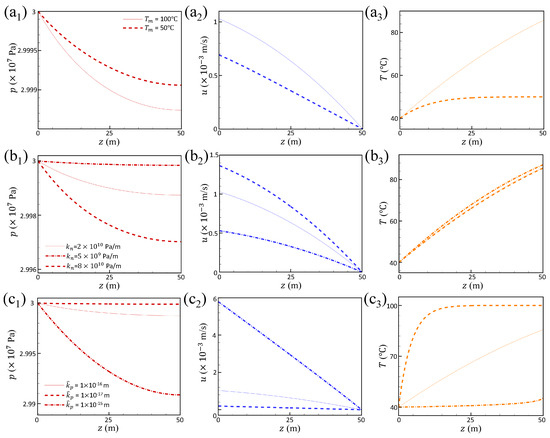 Figure 8 further presents the effects of rock properties, including the rock matrix temperature, stiffness, and permeability, on the dynamics and temperature of the liquid in a closed fracture. (a1,a2) show that the pressure gradient and the liquid speed are lower at the lower rock matrix temperature, due to the higher viscosity of the liquid. The lower rock temperature causes a lower liquid temperature (a3), and hence a higher liquid viscosity. (b1) shows that the interior pressure is higher but the pressure gradient is lower at the lower rock stiffness. The lower pressure gradient leads to a lower liquid speed in the fracture, as shown in (b2). The liquid temperature is slightly lower at the higher stiffness (b3), as the higher liquid speed strengthens the heat transfer. This finding agrees well with the theoretical and numerical studies proposed by Wang et al. [38], in that the temperature of the liquid in the fracture decreases with the faster flow. (c1,c2) show that the permeability plays a similar role in the pressure and speed profiles on the stiffness, suggesting that the pressure gradient and the interior speed increase with increasing permeability, which is in agreement with the study by Detournay and Garagash [39] on the near-tip region of a fluid-driven fracture. The permeability also alters the liquid temperature. (c3) presents that the liquid temperature is closer to the rock temperature at lower permeability, owing to the lower liquid speed.