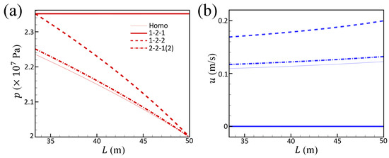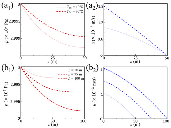 The profiles of the pressure and speed with different inlet temperature (a1,a2) and different fracture length (b1,b2) in a closed fracture with . The red and blue colors, respectively, represent the pressure and speed profiles.