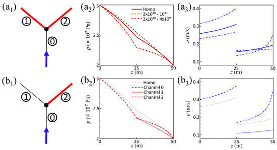 We first evaluate the role of the rock stiffness on the flow in the open bifurcated fracture with the boundary condition at the outlets defined by Equation (28). We assume the stiffness of the branches (channels 1 and 2) to be the same as shown in Figure 12(a1–a3), which shows the effect of the changing stiffness from the main channel (channel 0) to the branches (channels 1 and 2) on the pressure and speed profiles. Compared with the single fracture (as shown in Figure 4), both the pressure gradient and speed vary sharply at the connection of the channels in the bifurcated fracture due to the flow diversion. If the stiffness of the branches is higher than that of the main channel, the pressure at the channel connection increases ((a2)), but the inlet and outlet speeds of the bifurcated fracture decrease ((a2)) because of the reduced pressure gradient at the inlet and outlet.