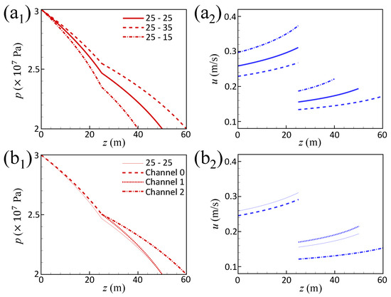 The profiles of pressure and speed with different inlet temperatures (a1,a2) and different fracture lengths (b1,b2) in an open fracture. The red and blue colors, respectively, represent the pressure and speed profiles.