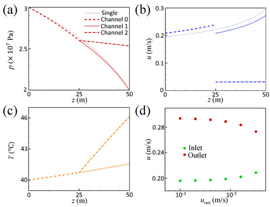 (a–c), respectively, show the profiles of the pressure, speed, and temperature in the bifurcated fractures, where channel 1 is open but channel 2 is closed, with a propagating speed of 0.032 m/s. The dashed, dotted, and dashed–dotted lines represent channels 0, 1, and 2, respectively. For comparison, we plot the profiles of a single fracture as a light solid line. (d) The variation of the inlet speed of channel 0 (green circles) and outlet speed of channel 1 (brown circles) with the given propagating speed of channel 2.