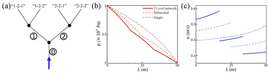 In this study, we focus on the dynamics of the upward flow in a 3-level fracture network, as shown in Figure 18a. At first, we assume the fracture network to be homogeneous, where all seven channels have the same parameters as listed in Table 1. The total length of the fracture is 50 m and all channels have same length. All channels on level 2 have open outlets. Figure 18b compares the pressure profile of the 3-level fracture network to that of the single and bifurcated fractures, suggesting that the interior pressure decreases with an increasing number of levels. Moreover, the inlet pressure gradient is higher while the outlet pressure gradient is lower in the fracture with more levels. As a result, the inlet speed of the fracture increases with the number of levels, whereas the outlet speed decreases, as shown in Figure 18c.