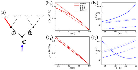 (a) illustrates the 3-level fracture network in which the parameters of channel 1-2-1 (red line) are different from those of the other channels. (b1,b2), respectively, show the pressure and speed profiles in the channels on level 2 when the stiffness of channel 1-2-1 is at a lower value than that of other channels (4 × 109 Pa/m). (c1,c2), respectively, show the pressure and speed profiles in the channels on level 2 when the permeability of channel 1-2-1 is at a higher value than that of other channels (1 × 10−3 m). For comparison, we plot the profiles of the homogeneous fracture network as light lines.