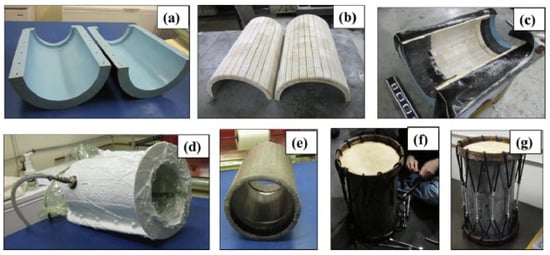 (a) Two-part mold; (b) prefabricated balsa core; (c) placement of carbon fiber; (d) vacuum bagging; (e) demolded part; (f) assembly of drumhead; (g) finished drum. Reprinted from [29] with permission from Elsevier. Copyright 2015 Elsevier.