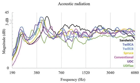 The violin stands as one of the most extensively studied musical instruments. Duerinck et al. [60] dedicated their research to establish a measurement protocol for potential modal analysis evaluations of wooden violins. In their investigation, both a carbon and a wooden violin were subjected to testing. The measurements primarily focused on coherence, the occurrence frequency of signature modes, their damping characteristics, and the associated risk factors linked to each measurement method. In the latter case, the FRF was computed for various inputs and outputs. The violins were excited using an impact hammer, an electromagnetic shaker, a piezoelectric element, and a loudspeaker, while the response was captured through the utilization of an accelerometer and a laser scanning vibrometer. Moreover, Duerinck et al. [12] performed listener experiments for the evaluation of violins made of composites. Soundboards made of various composites were attached to a violin body, in a way that the only difference among the violins was the soundboard. Part of the study was the measurement of the acoustic radiation of the violins in a hemianechoic room with an impact hammer excitation. The variation in the radiation is shown in Figure 6. The study concluded that diverse sounds and timbres of violins made from fiber-reinforced polymers can be produced.