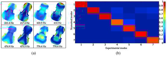 Zambrano et al. [13] discussed about the performance of violins made from carbon fiber composites and wooden ones, using finite element modal analysis for their comparison. The models underwent validation through comparisons with experimental studies conducted by other researchers, leading to the conclusion that, for instruments sharing identical geometry, a superiority of wood over CFRP was evident. Dominy and Killingback [77] presented the development of a carbon fiber violin. During the manufacturing process, they performed modal analysis in the frequency domain using laser vibrometer measurements. Furthermore, the investigations conducted by Lu [71] and Kaselouris et al. [72] using FEM simulations delved into the feasibility of replacing the conventional wood material in top plates with composite materials. The outcomes of both studies revealed a noteworthy distinction in the vibrational characteristics between composite soundboards and their traditional wooden counterparts. Viala et al. [63] employed a bio-based composite material for the violin top plate in their study, wherein they conducted an analysis to determine its elastic and damping properties through the application of an inverse method. This involved a synergistic approach that combined modal finite element analysis and experimental modal measurements. The soundboard was excited by a speaker and the velocity of the vibration was detected by a scanning laser 3D vibrometer. The 3D velocity fields were used to estimate the modal basis. To validate their methodology, the authors compared the vibration modes by assessing the congruence between the results obtained from both measurements and simulations. They also used the modal assurance criterion (MAC) for the comparison of numerical and experimental modes of vibration. Representative results of their validation comparisons are shown in Figure 7.