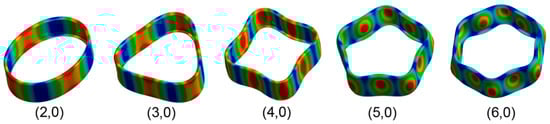 The manufacturing of the shell of an Indian drum made of composite materials was proposed by Damodaran et al. [29]. The drum shell was manufactured as a sandwich configuration. The outer wall was a carbon fiber/epoxy face sheet, and the core was made of balsa. The performed flexural vibration measurements led to the calculation of the Young’s modulus based on the resonance frequency, and the internal friction based on the vibration damping. For the extraction of the mode shapes, the frequency response function of the drum with the composite shell was calculated by an input provided by an impact hammer and an output as recorded by a microphone. To replace the traditional wooden top plates by composite ones, Phillips et al. [28] investigated the properties of a flax-reinforced (bio-composite) sandwich panel. Modal analysis was used to calculate the Young’s and shear modulus, internal friction, and static mechanical properties. The specimen under investigation was excited by a steel ball. After the top plate characterization, a ukulele was manufactured and qualitatively compared to a high-quality wooden ukulele. The comparison results showed that the flax-reinforced sandwich structure can successfully act as a top plate. The impact on the resonant frequencies of a drum shell made of composite CFRE by using structural reinforcements at the edges of the composite drum shell was studied by Ibáñez-Arnal et al. [16]. The study combined finite element and modal analysis. For the latter research, a resonance detection method based on the external excitation of the shell by sine wave was utilized and piezo sensor was used to record the response. Figure 9 demonstrates representative modes of vibration extracted from the simulations.