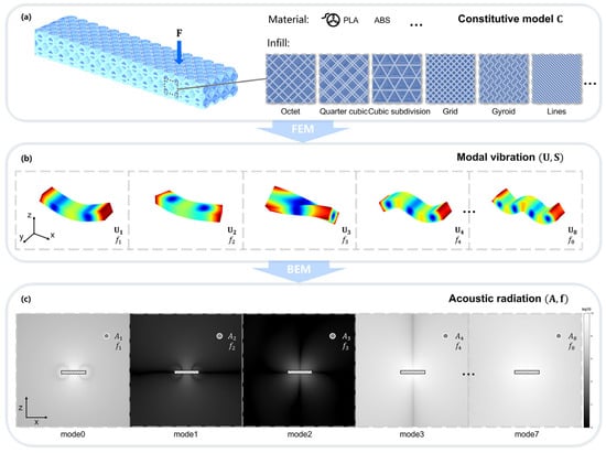 Modal sound synthesis process. (a) The constitutive model is established for modal vibration macroscopically describing the mechanical performance of different filament materials and infill patterns. (b) Sequential mode frequencies and shapes are computed, where eigenvector U indicates mode shape, and eigenvalue S = 4π2f2 indicates mode vibration frequencies. (c) Acoustic radiation is generated by the pairs of surface vibrations, and certain modes are amplified depending on the impact force position, where A is the sound amplitude at a spatial location, and f is the frequency. Reprinted from [80] with permission from Elsevier. Copyright 2023 Elsevier.