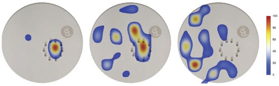 Density distribution of maximum pressure amplitude values of modes on the drum up to 1 kHz for three hammer strike positions (color bar in percentage of maximum density). (Left): strike in the ring, (middle): strike at ring rim, (right): strike outside the ring at the opposite side of the ring. While most maximum values for the strike in the ring are in the ring, few are within the ring when the drum is struck outside the ring. A medium case is found when striking at the ring rim. (Reprinted with permission from [55]. Copyright 2020, Acoustical Society of America.