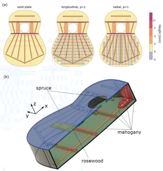 (a) Diagrams of the soundboards in three different configurations: solid, with longitudinal holes, and with radial holes. With p = 1, the major semiaxis of the elliptical holes is 10 mm long, while the minor semiaxis is 2.5 mm long. The figure shows the bracing and the hole patterns, and each surface is colored according to its height with respect to the lower surface of the plate. (b) Three-dimensional cut view of the model of the instrument’s body, showing all the individual components. Reproduced under a Creative Commons Attribution 4.0 International License [57]. Copyright 2022, MDPI.