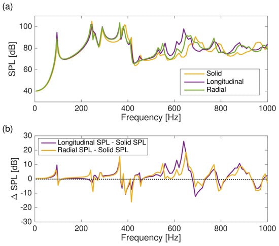 The sound pressure levels of the entire instrument body are compared between the solid top and two metamaterial configurations. This analysis involved applying a harmonic load perpendicular to the surface on a circular area with a 2 mm radius situated on the soundboard beneath the bridge, at the midpoint of the lower bout. (a) Absolute value of the SPL; (b) relative difference between the guitar with a solid top and the guitar with a metamaterial top plate. Reproduced under a Creative Commons Attribution 4.0 International License [57]. Copyright 2022, MDPI.